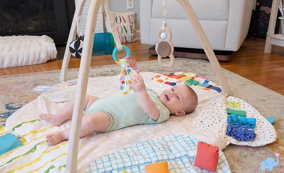 Rather than simply adding random textures and toys, it organizes much of the experience into distinct play areas that encourage visual exploration, reaching, tactile discovery, and eventually simple problem-solving.