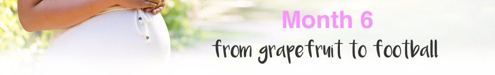 The sixth month is the last month of the second trimester, extending from weeks 23 to 27. Some serious fetal growth happens during this time, resulting in your baby ending up about the size of a football and weighing about 2 pounds!